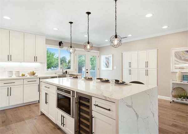 Màu trắng giúp không gian trông sáng sủa và rộng rãi hơn. Những chiếc tủ màu trắng rất phù hợp khi phối với tay cầm kim loại, chúng làm cho kim loại trông tinh xảo hơn. Thêm những chiếc đèn treo kim loại là bạn đã có một không gian bếp cực kỳ sang trọng.