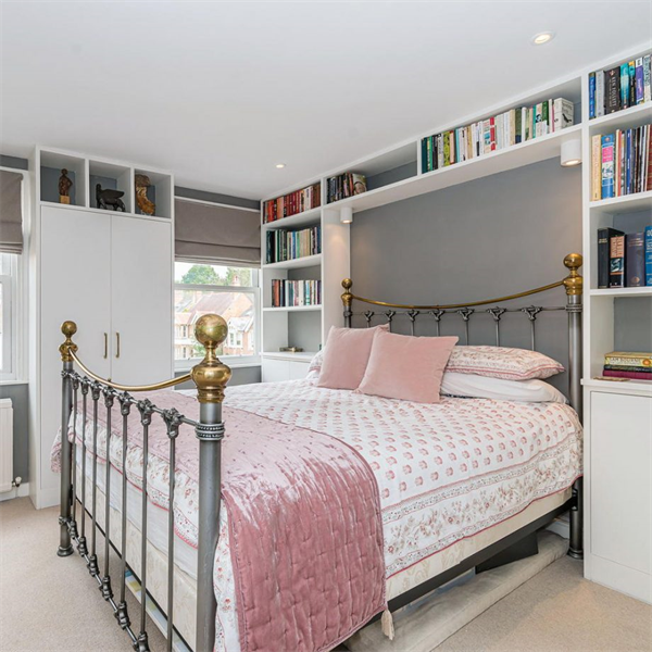Bốn phòng ngủ được bố trí ở hai tầng trên của ngôi nhà. Nhiều người thường nghĩ rằng kệ sát trần là một khái niệm đã lỗi thời, nhưng khi biết cách trang trí, nó có thể tạo ra một nơi để sách hoặc trưng bày các vật phẩm rất đẹp mắt. Đây thực sự là cách thông minh để tận dụng được không gian trống.