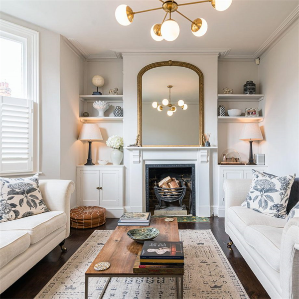 Khi bước vào bên trong, bạn sẽ cảm nhận được sự yên tĩnh ở phòng khách với tông màu trắng ôn hòa. Trần nhà cao được trang trí thêm phào chỉ kết hợp với lò sưởi trang nhã tạo thêm cảm giác sang trọng cho không gian. Chiếc gương lớn viền vàng cùng với đèn chùm hình cầu làm tăng yếu tố xa hoa hiện đại. Những chiếc ghế sofa có tay cuộn và chiếc đệm ngồi màu đồng trong căn phòng chấm phá thêm nét cổ điển cho ngôi nhà.