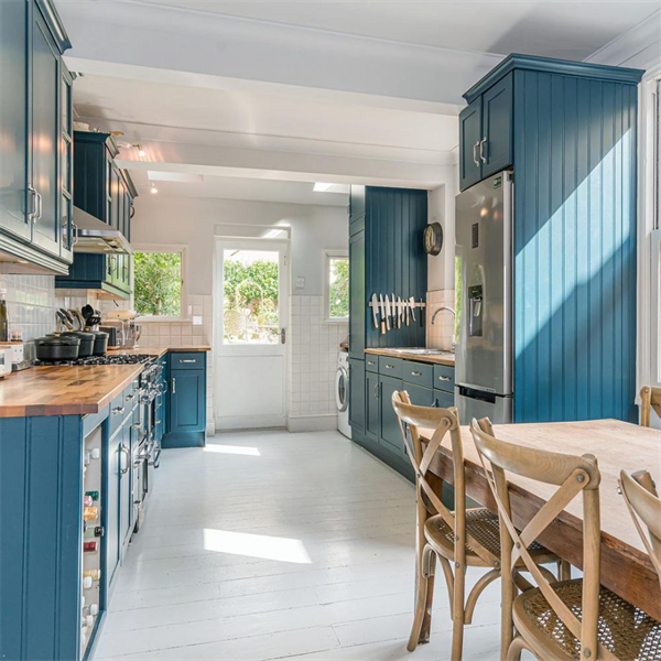 Phòng bếp lấy màu xanh dương làm điểm nhấn, mang vẻ ấn tượng và cá tính. (Ảnh: Ideal Home)