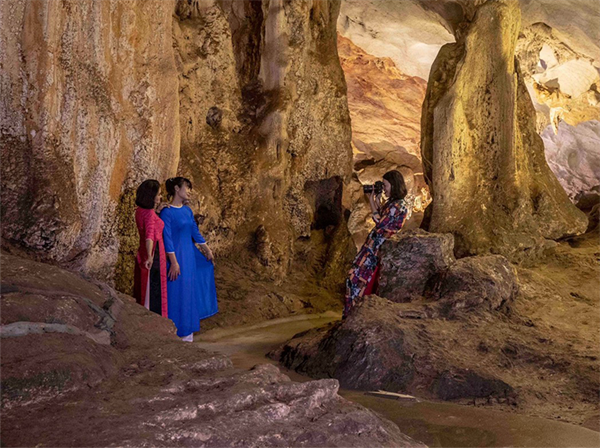 Du khách chụp ảnh lưu niệm tại khu du lịch hang động Vũng Đục.Bên cạnh đó, các điểm du lịch đang được các doanh nghiệp tích cực chuẩn bị cơ sở vật chất, nâng cấp hạ tầng, áp dụng chương trình khuyến mại.