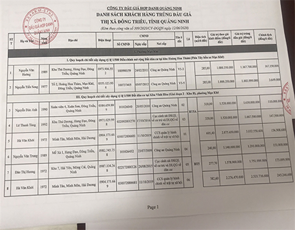 Danh sách khách hàng trúng đấu giá.