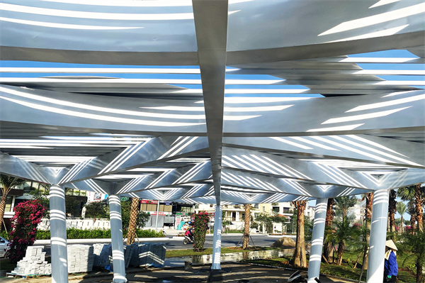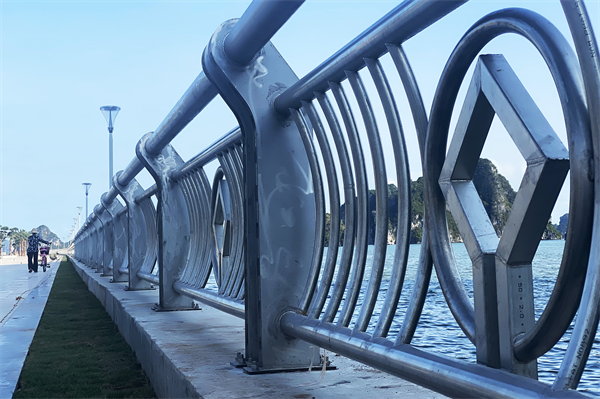 Lan can có kết cấu thép, cách điệu biểu tượng di sản thế giới là một hình vuông nối tiếp trong một hình tròn.