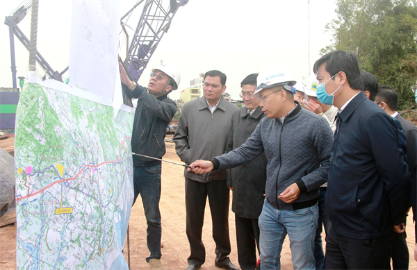Đồng chí Nguyễn Tường Văn, Chủ tịch UBND tỉnh, nghe đơn vị thi công báo cáo tiến độ thi công cao tốc Vân Đồn - Móng Cái. Ảnh: Mạnh Trường