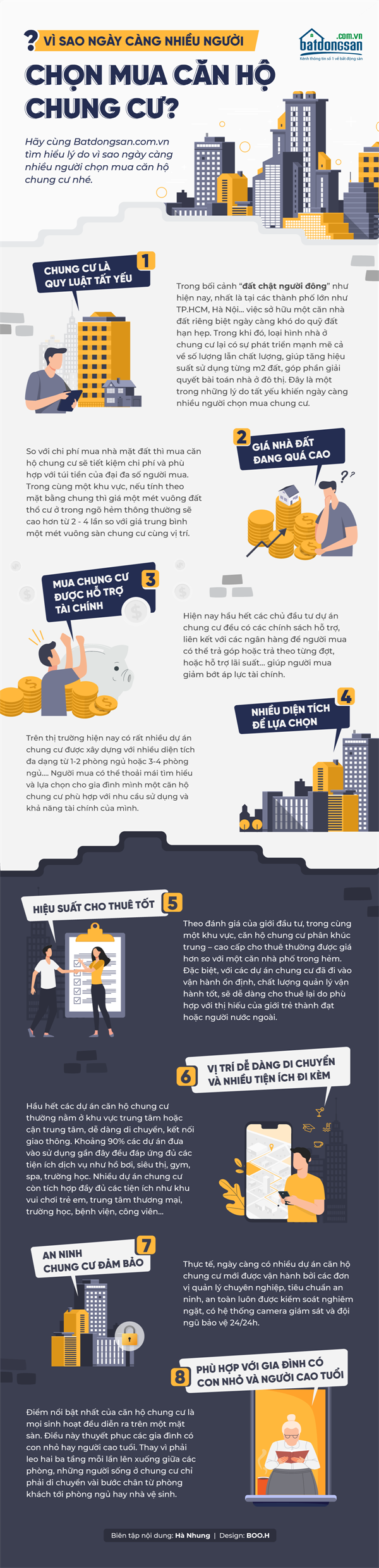 Đánh giá về xu hướng mua nhà thời gian qua, ông Nguyễn Văn Đính - Phó chủ tịch Hội môi giới BĐS Việt Nam cho biết, xu hướng ở chung cư đang phổ biến tại TP.HCM trong vài năm trở lại đây (mặc dù vẫn còn một bộ phận giữ quan niệm nhà liền thổ vẫn tốt hơn). Chọn lựa sống tại chung cư đã và sẽ là xu hướng ưu tiên của người trẻ vì không gian căn hộ được bài trí thông minh, tối ưu hóa công năng và diện tích sử dụng. Đặc biệt trong bối cảnh phân khúc chung cư có sự phát triển mạnh mẽ, đạt được sự hoàn thiện từ tiện ích, dịch vụ, môi trường sống đến kết nối giao thông.